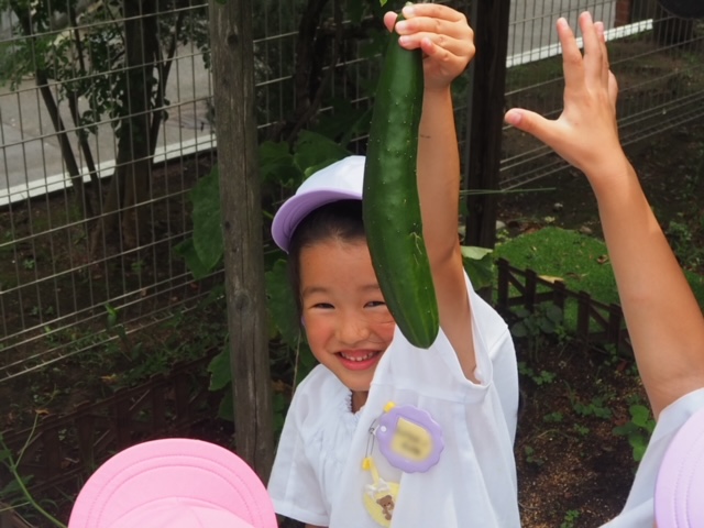 先日、幼稚園で育てていたきゅうりの収穫を行いました。全クラスで水と愛情を注いだ結果、大きなきゅうりが実りました!