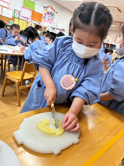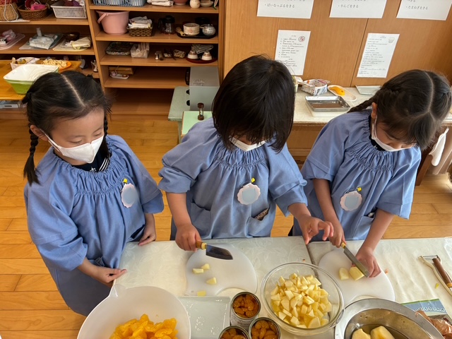野菜や果物の下ごしらえは、年長さんの保護者の方にお手伝いしていただきました。