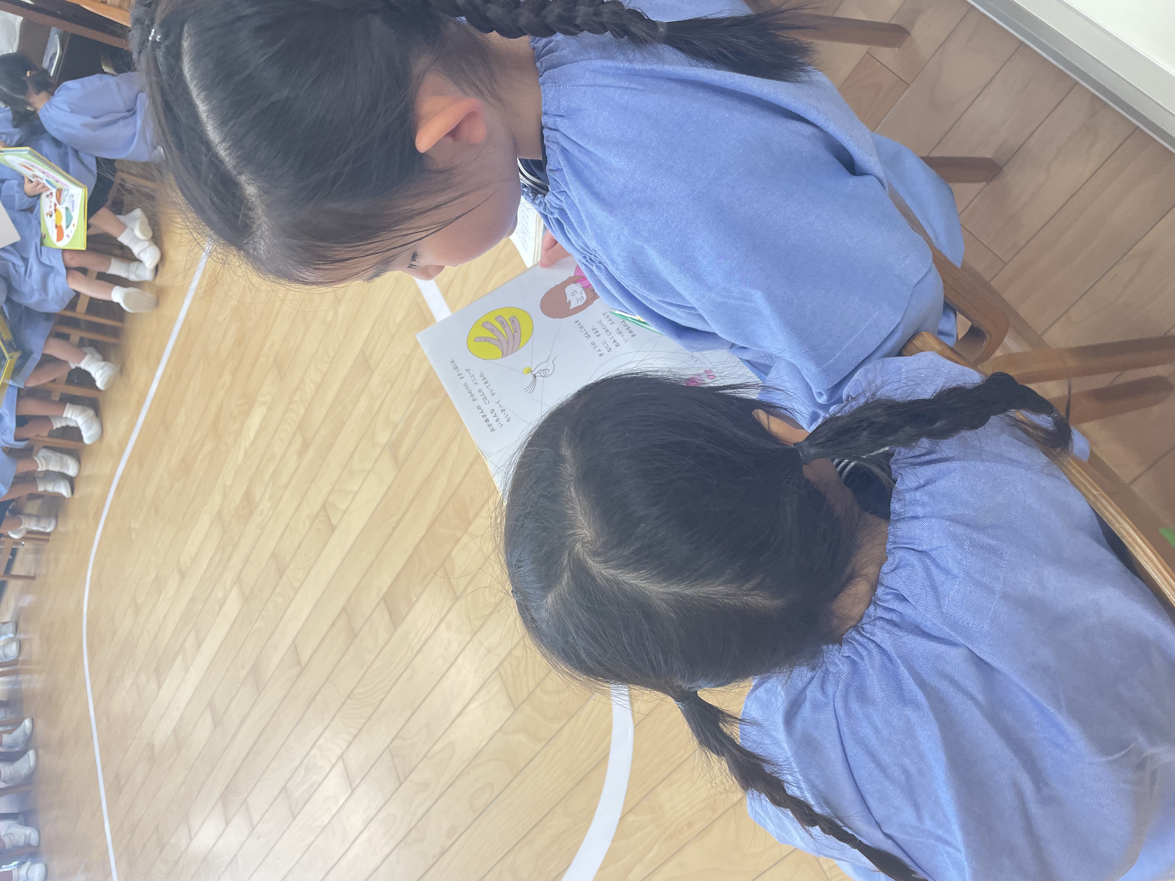 不安そうな表情をしたり泣いている子もいましたが、そんな年少さんの手を引き、身支度を教えてあげたり、本を読んであげたり、優しく寄り添う頼もしい年長さんの姿がありました。