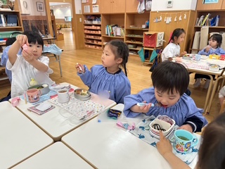 「見て見て!」「おいしいね!」と、お友達とのやりとりも楽しみながら、心もお腹も満たされるひとときになっています。