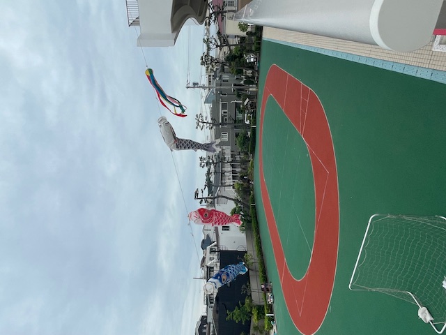 幼稚園にも、大きな鯉のぼりが力強く空を泳いでいます。